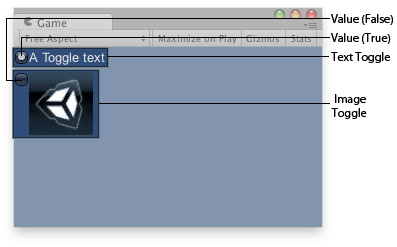 # [GUILayout](https://docs.unity3d.com/cn/2019.4/ScriptReference/GUILayout.html).Toggle public static bool **Toggle** (bool **value**, [Texture](https://docs.unity3d.com/cn/2019.4/ScriptReference/Texture.html) **image**, params GUILayoutOption[] **options**); public static bool **Toggle** (bool **value**, string **text**, params GUILayoutOption[] **options**); public static bool **Toggle** (bool **value**, [GUIContent](https://docs.unity3d.com/cn/2019.4/ScriptReference/GUIContent.html) **content**, params GUILayoutOption[] **options**); public static bool **Toggle** (bool **value**, [Texture](https://docs.unity3d.com/cn/2019.4/ScriptReference/Texture.html) **image**, [GUIStyle](https://docs.unity3d.com/cn/2019.4/ScriptReference/GUIStyle.html) **style**, params GUILayoutOption[] **options**); public static bool **Toggle** (bool **value**, string **text**, [GUIStyle](https://docs.unity3d.com/cn/2019.4/ScriptReference/GUIStyle.html) **style**, params GUILayoutOption[] **options**); public static bool **Toggle** (bool **value**, [GUIContent](https://docs.unity3d.com/cn/2019.4/ScriptReference/GUIContent.html) **content**, [GUIStyle](https://docs.unity3d.com/cn/2019.4/ScriptReference/GUIStyle.html) **style**, params GUILayoutOption[] **options**); ## 参数 | value | 该按钮是打开还是关闭? | | --------- | ----------------------------------------------------------------------------------------------------------------------------------------------------------------------------------------------------------------------------------------------------------------------------------------------------------------------------------------------------------------------------------------------------------------------------------------------------------------------------------------------------------------------------------------------------------------------------------------------------------------------------------------------------------------------------------------------------------------------------------------------------------------------------------------------------------------------------------------------------------------------------------------------------------------- | | text | 要在按钮上显示的文本。 | | image | 要在按钮上显示的 [Texture](https://docs.unity3d.com/cn/2019.4/ScriptReference/Texture.html)。 | | content | 该按钮的文本、图像和工具提示。 | | style | 要使用的样式。如果省略,则使用当前 [GUISkin](https://docs.unity3d.com/cn/2019.4/ScriptReference/GUISkin.html) 的 `button` 样式。 | | options | (可选)一个布局选项列表,用于指定额外的布局属性。此处传递的任何值都将覆盖 `style` 定义的设置。另请参阅:[GUILayout.Width](https://docs.unity3d.com/cn/2019.4/ScriptReference/GUILayout.Width.html)、[GUILayout.Height](https://docs.unity3d.com/cn/2019.4/ScriptReference/GUILayout.Height.html)、[GUILayout.MinWidth](https://docs.unity3d.com/cn/2019.4/ScriptReference/GUILayout.MinWidth.html)、[GUILayout.MaxWidth](https://docs.unity3d.com/cn/2019.4/ScriptReference/GUILayout.MaxWidth.html)、[GUILayout.MinHeight](https://docs.unity3d.com/cn/2019.4/ScriptReference/GUILayout.MinHeight.html)、 [GUILayout.MaxHeight](https://docs.unity3d.com/cn/2019.4/ScriptReference/GUILayout.MaxHeight.html)、[GUILayout.ExpandWidth](https://docs.unity3d.com/cn/2019.4/ScriptReference/GUILayout.ExpandWidth.html)、[GUILayout.ExpandHeight](https://docs.unity3d.com/cn/2019.4/ScriptReference/GUILayout.ExpandHeight.html)。 | ## 返回 **bool** 按钮的新值。 ## 描述 创建一个打开/关闭的开关按钮。  \ *游戏视图中的切换按钮。* ``` using UnityEngine; public class ExampleScript : MonoBehaviour { // Draws 2 toggle controls, one with a text, the other with an image. Texture aTexture; bool toggleTxt = false; bool toggleImg = false; void OnGUI() { if (!aTexture) { Debug.LogError("Please assign a texture in the inspector."); return; } toggleTxt = GUILayout.Toggle(toggleTxt, "A Toggle text"); toggleImg = GUILayout.Toggle(toggleImg, aTexture); } } ```